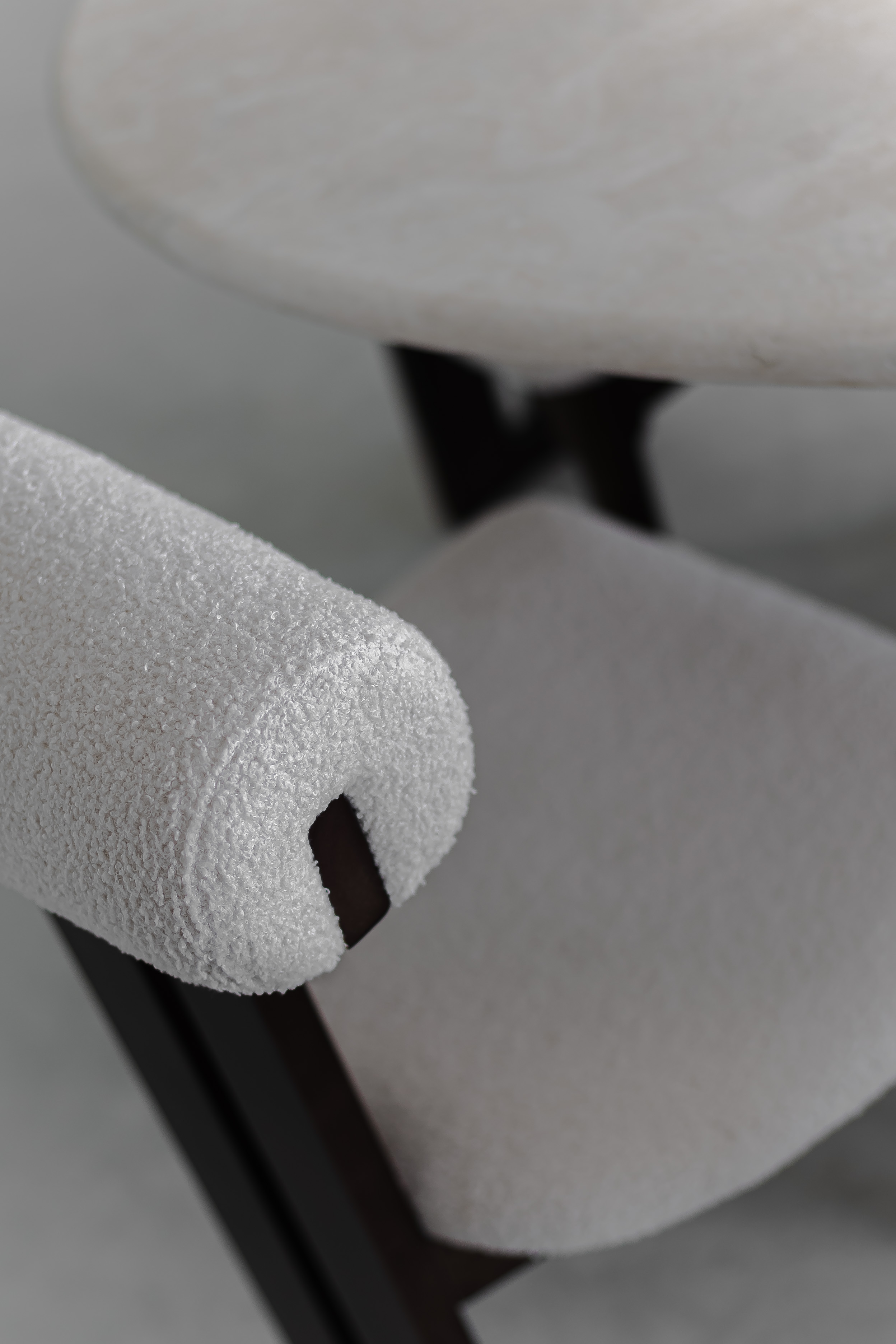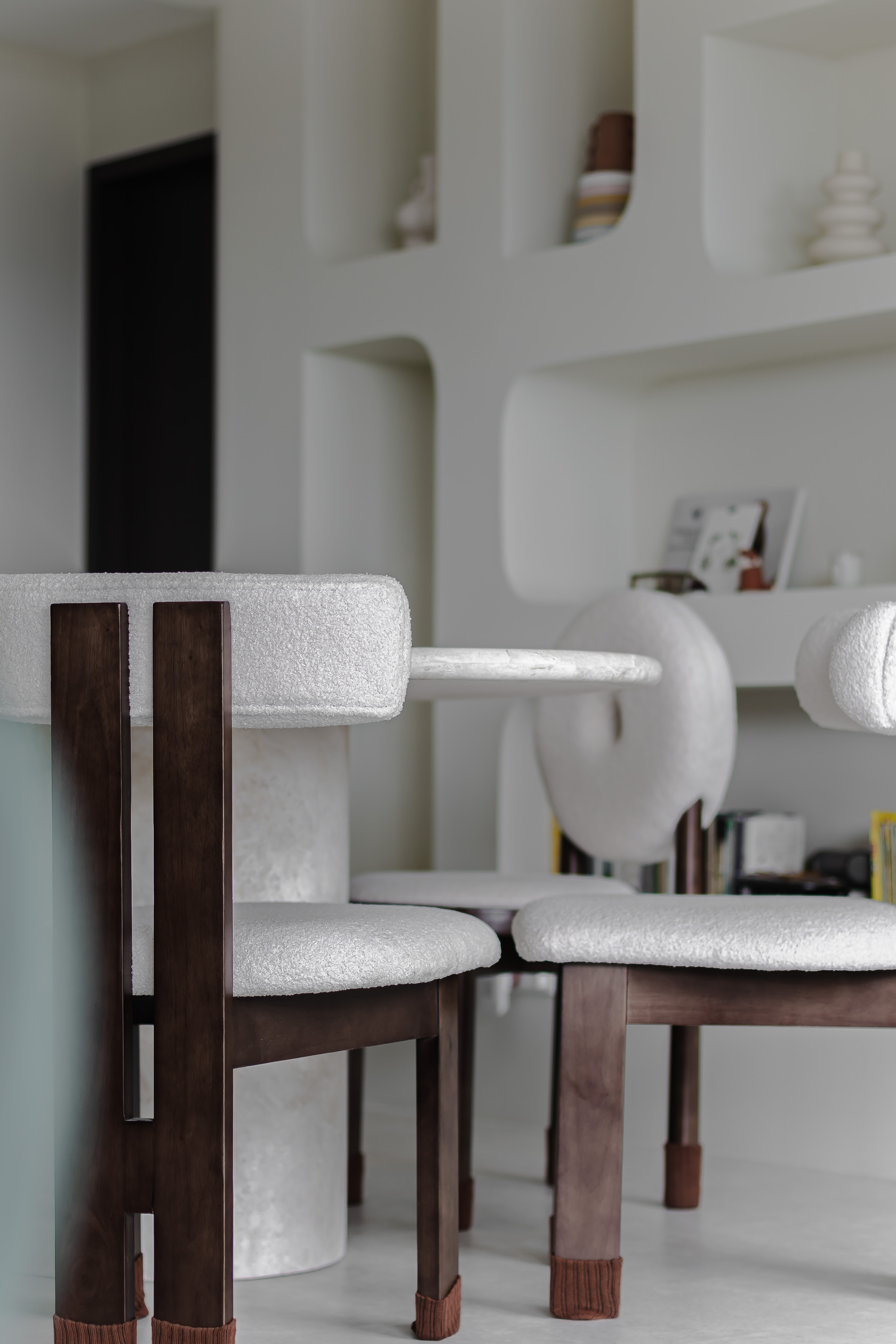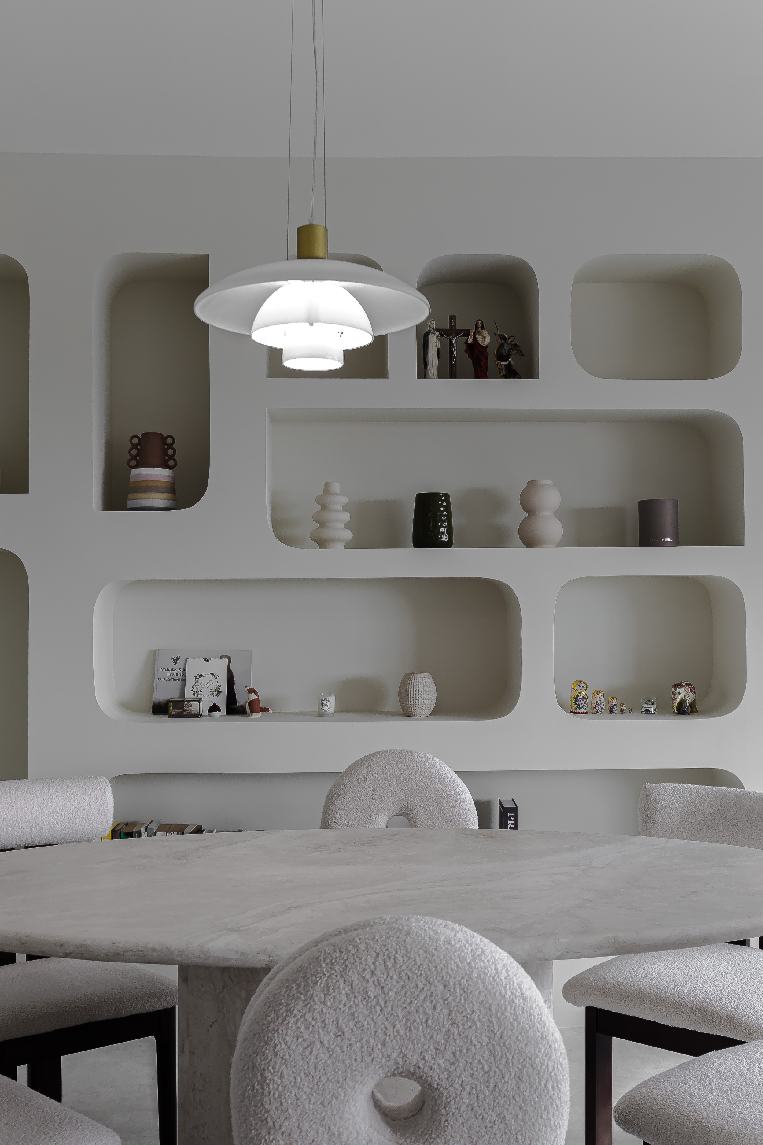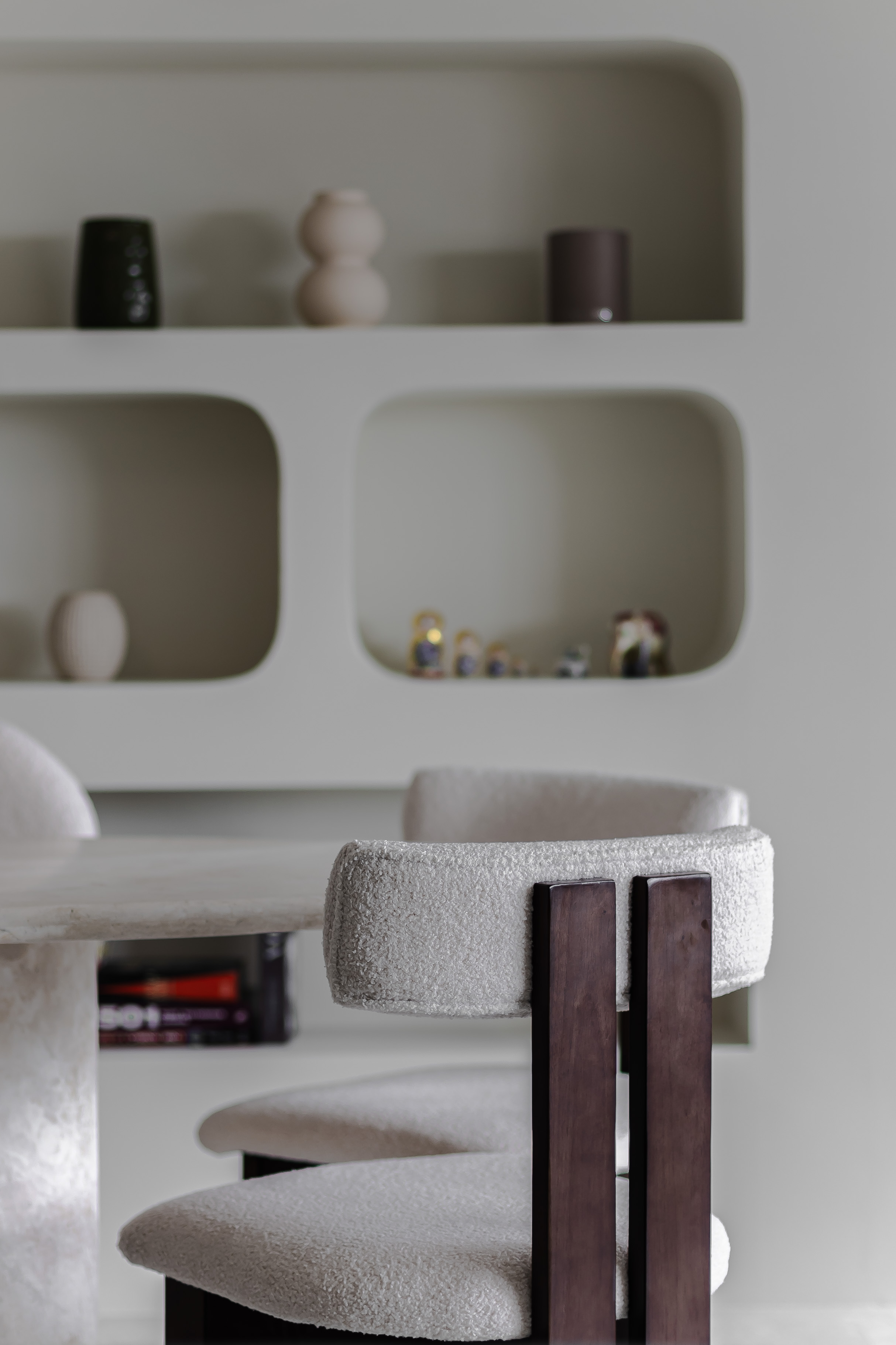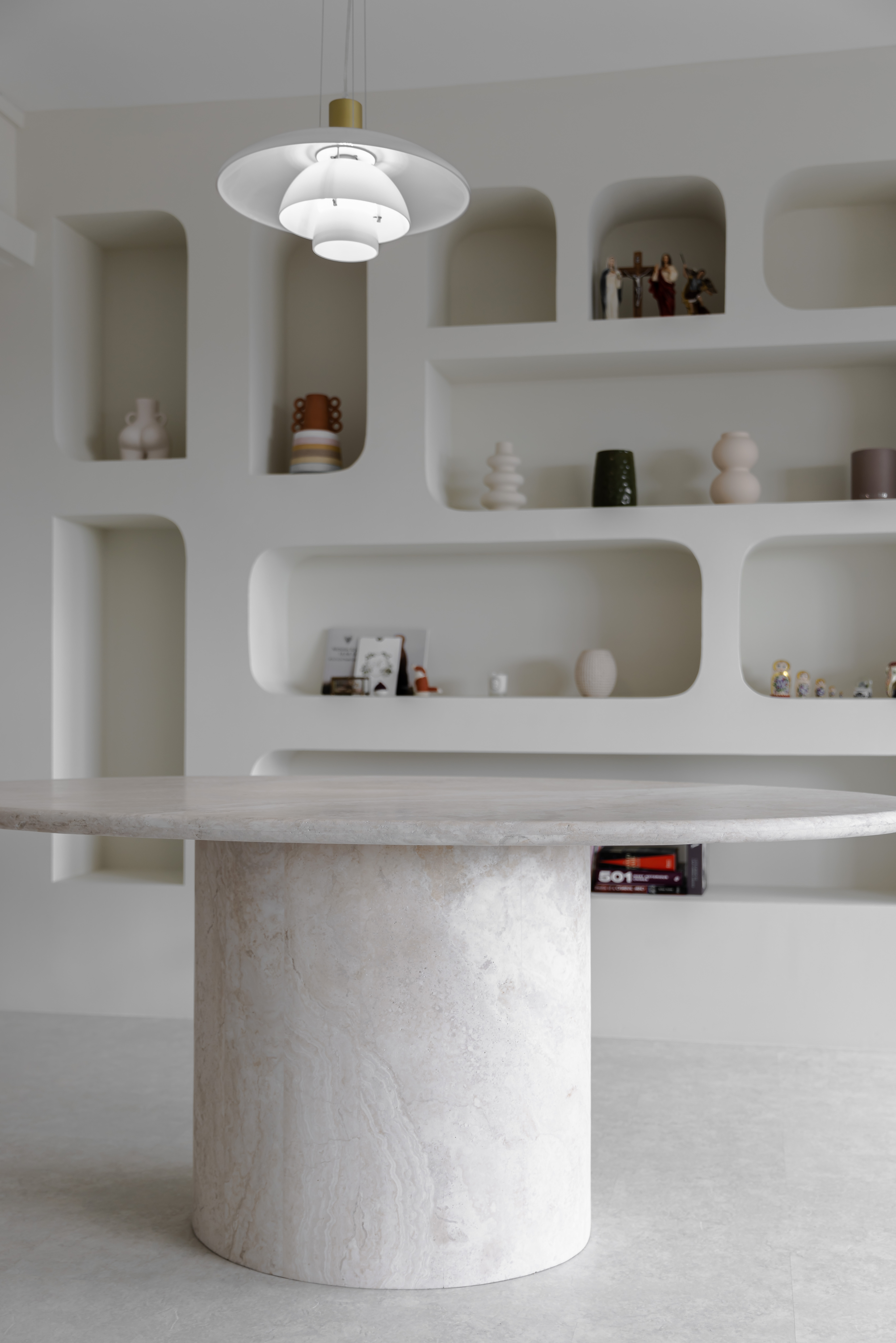 This dining space is designed encapsulated the soul of this Japanese aesthetic, mirroring the allure of impermanence and the innate everyday charm. Our client is looking to customise a travertine dining table that is statement enough to be a centerpiece, and steering away from the conventional off-the-rack wooden tables. With our client’s request on hand, we designed an oval table with a matching oval base, using white Roman travertine for visually dynamic patterns. To add contrast and visual interest, our client have also assembled upholstered armchairs with unique wooden frames to match the contours of the dining table top.