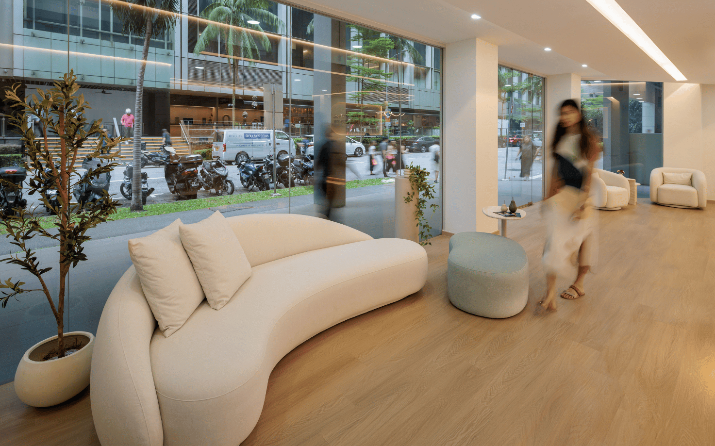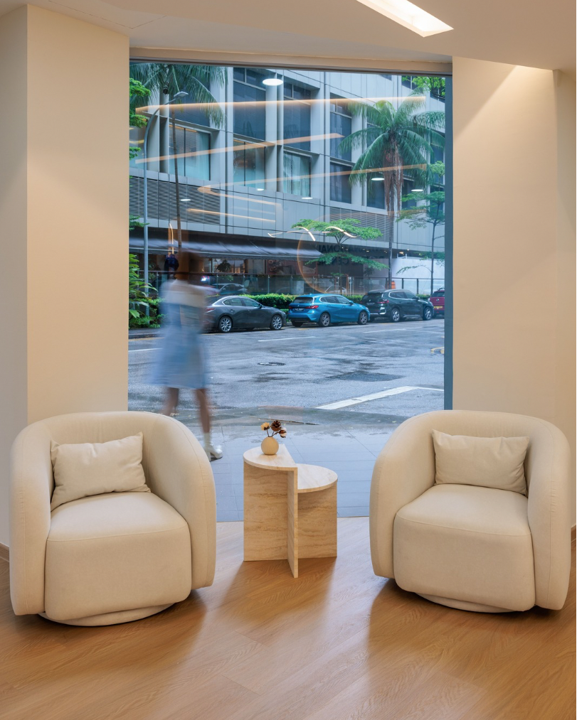 In response, we designed and customised furniture to define two welcoming lounge areas, offering guests a comfortable and soothing space before their appointments. Situated in the heart of Tras Street, Tanjong Pagar, the furniture was carefully considered for both interior and exterior viewpoints, embracing gentle curves that echo the reception’s architectural form. Cove lighting was integrated to enhance the flow, creating a cohesive and serene atmosphere that balances professionalism with comfort.