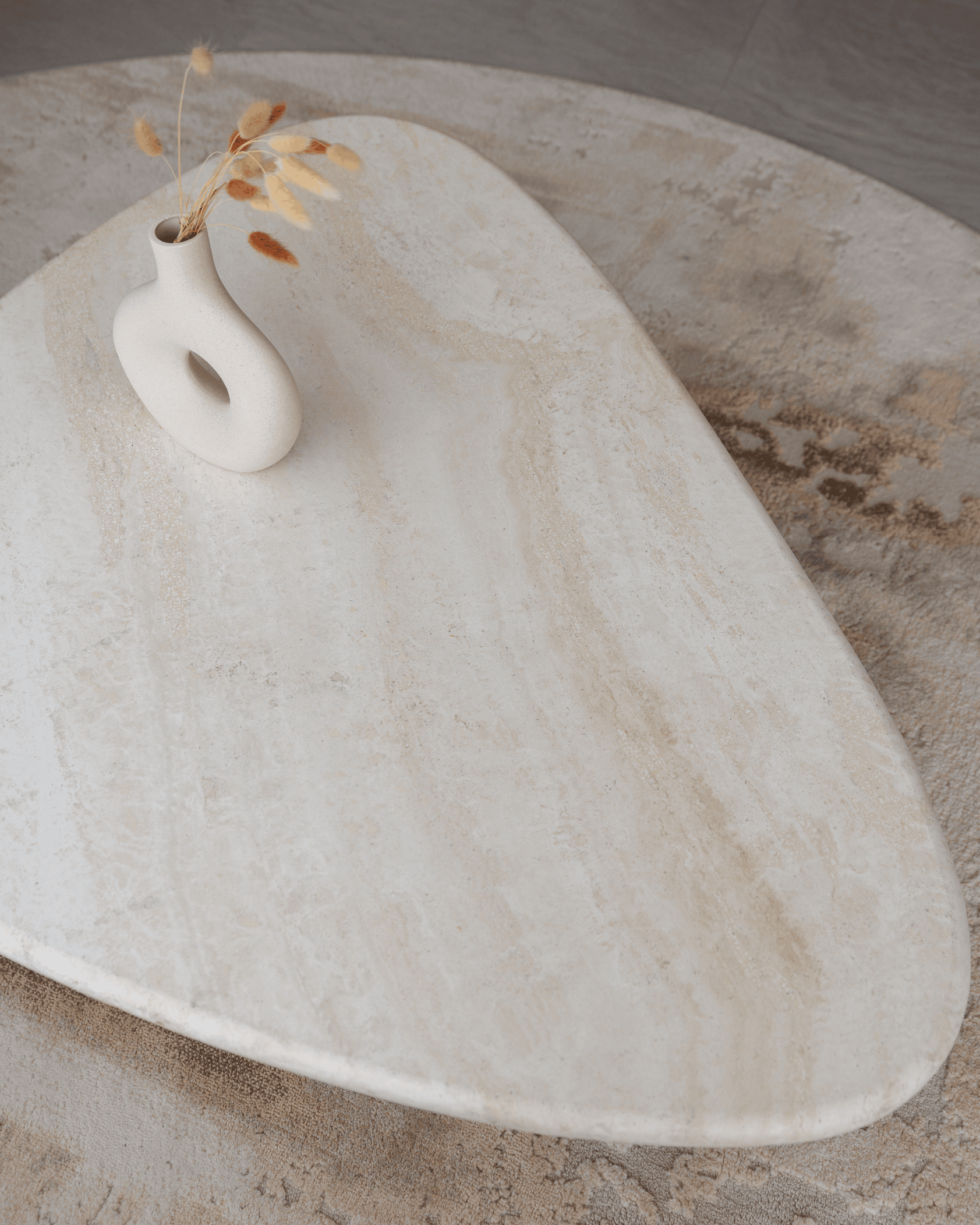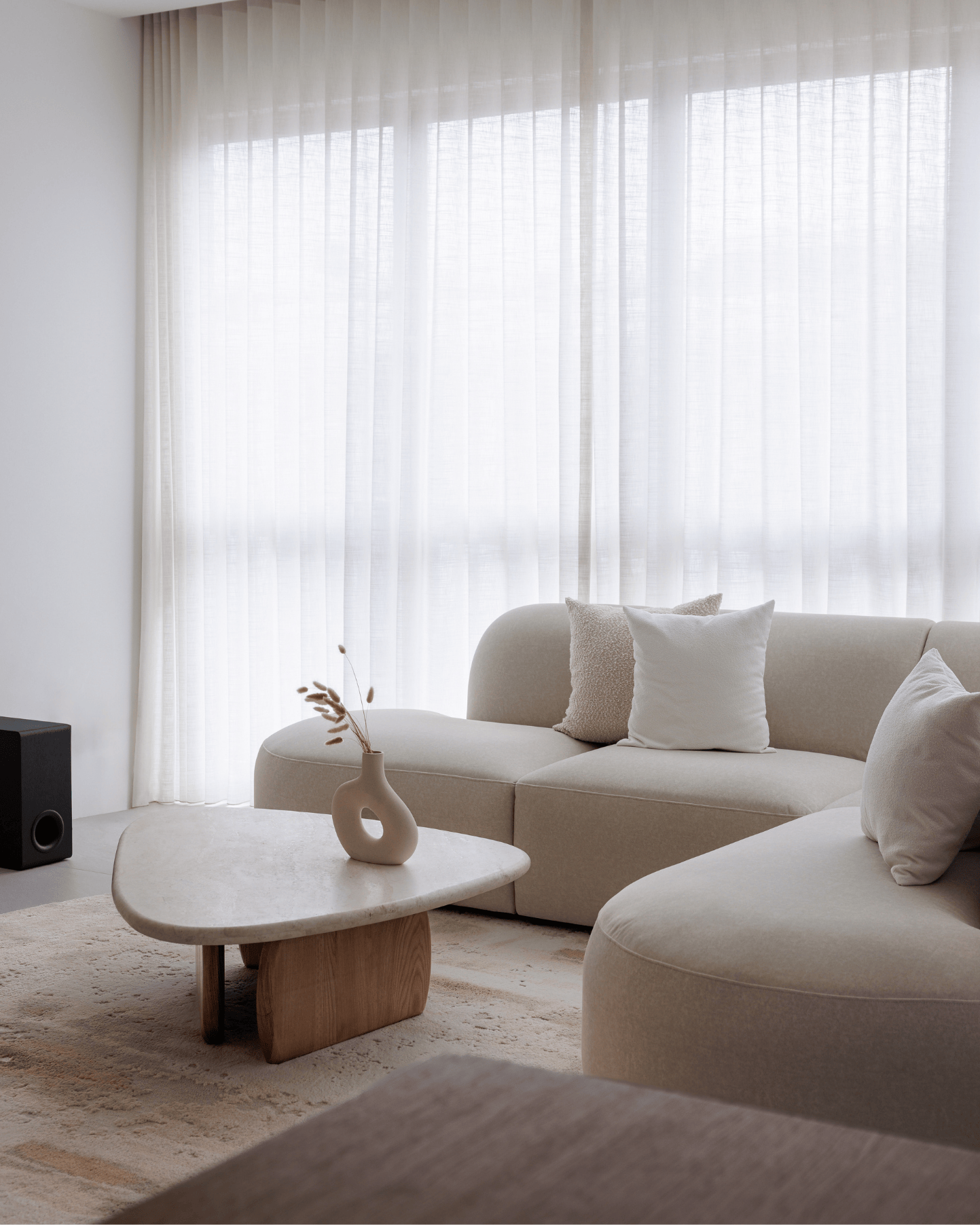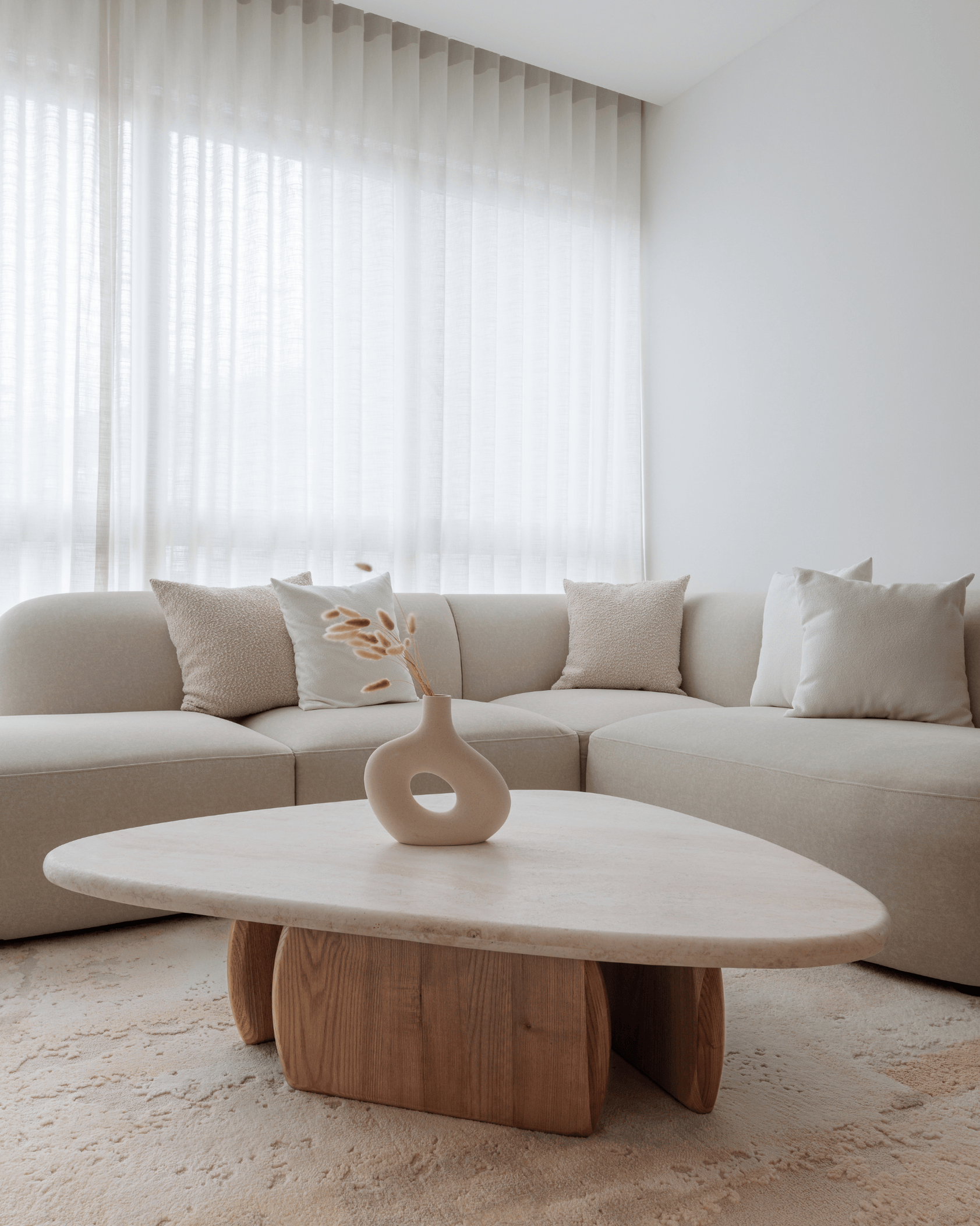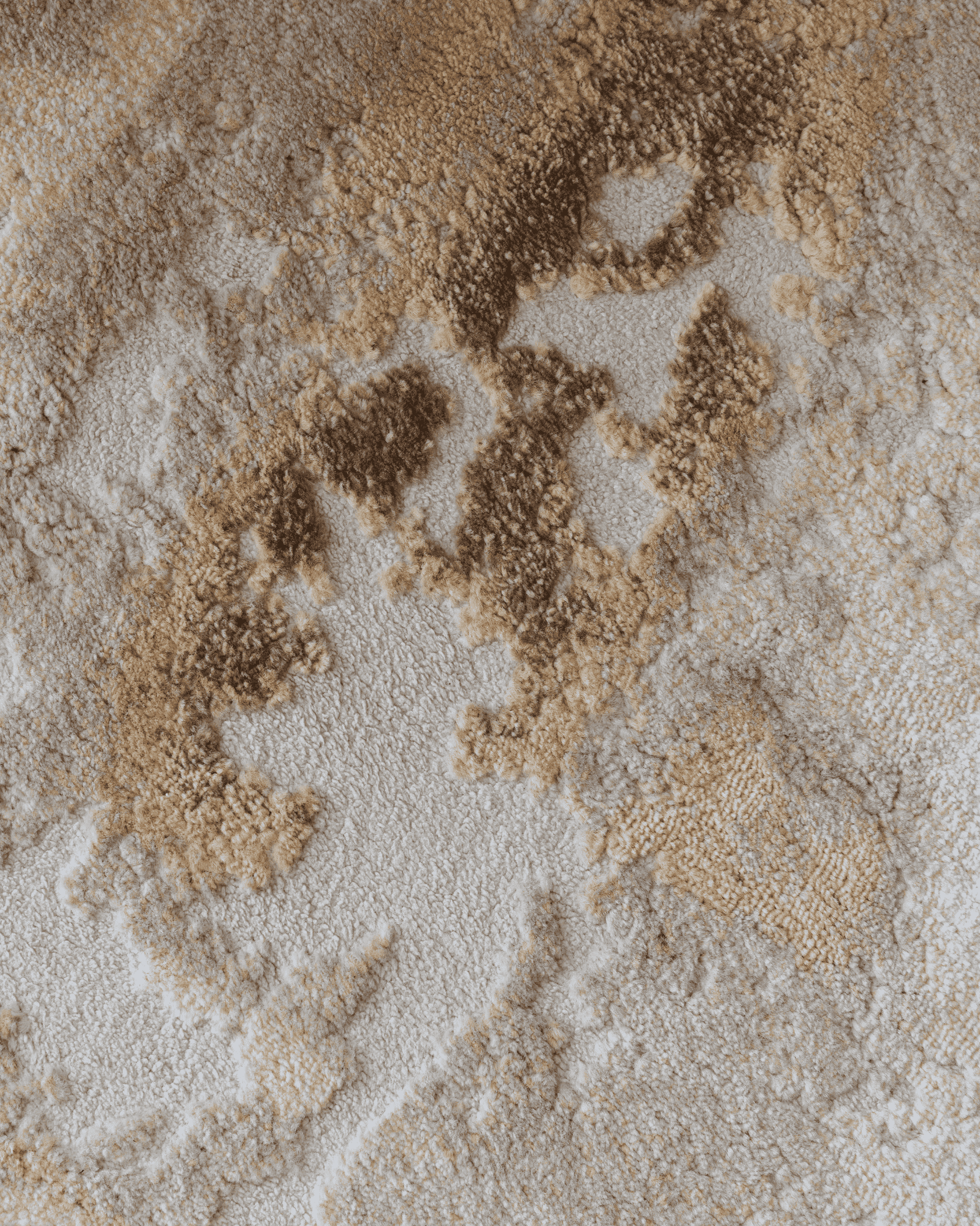 To enhance depth and visual interest, subtle accents of dark smoked oak and deep earth tones punctuate the design without overpowering its tranquility. The Rowena rug plays a key role in tying the space together, its warm brown hues echoing the tones of the dining chairs, sofas and coffee table. When selecting neutrals for wall laminates, décor, and textiles, we leaned into warm whites or wood as a foundation, layering in soft greys, browns, and beiges to craft a dreamlike, inviting retreat.