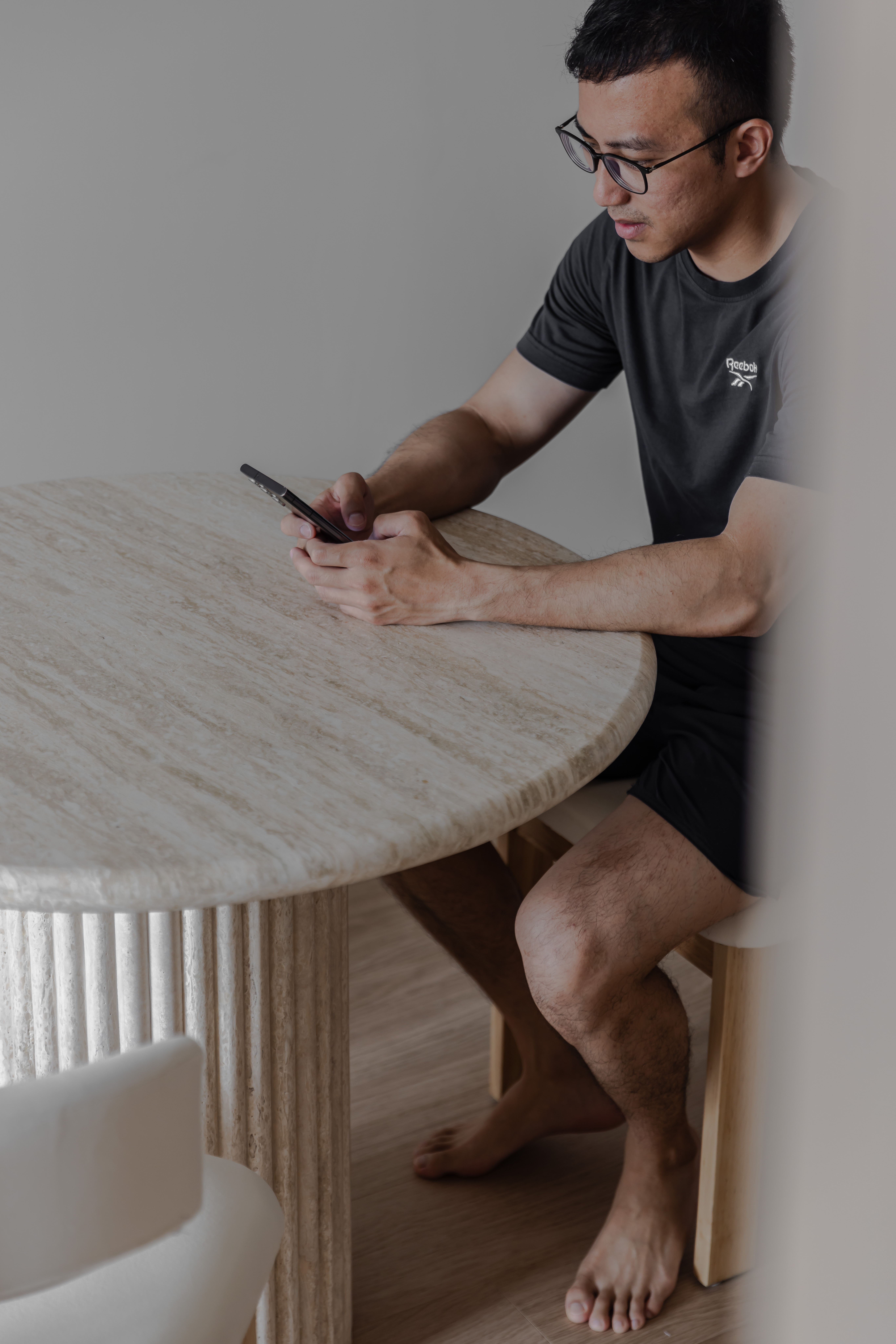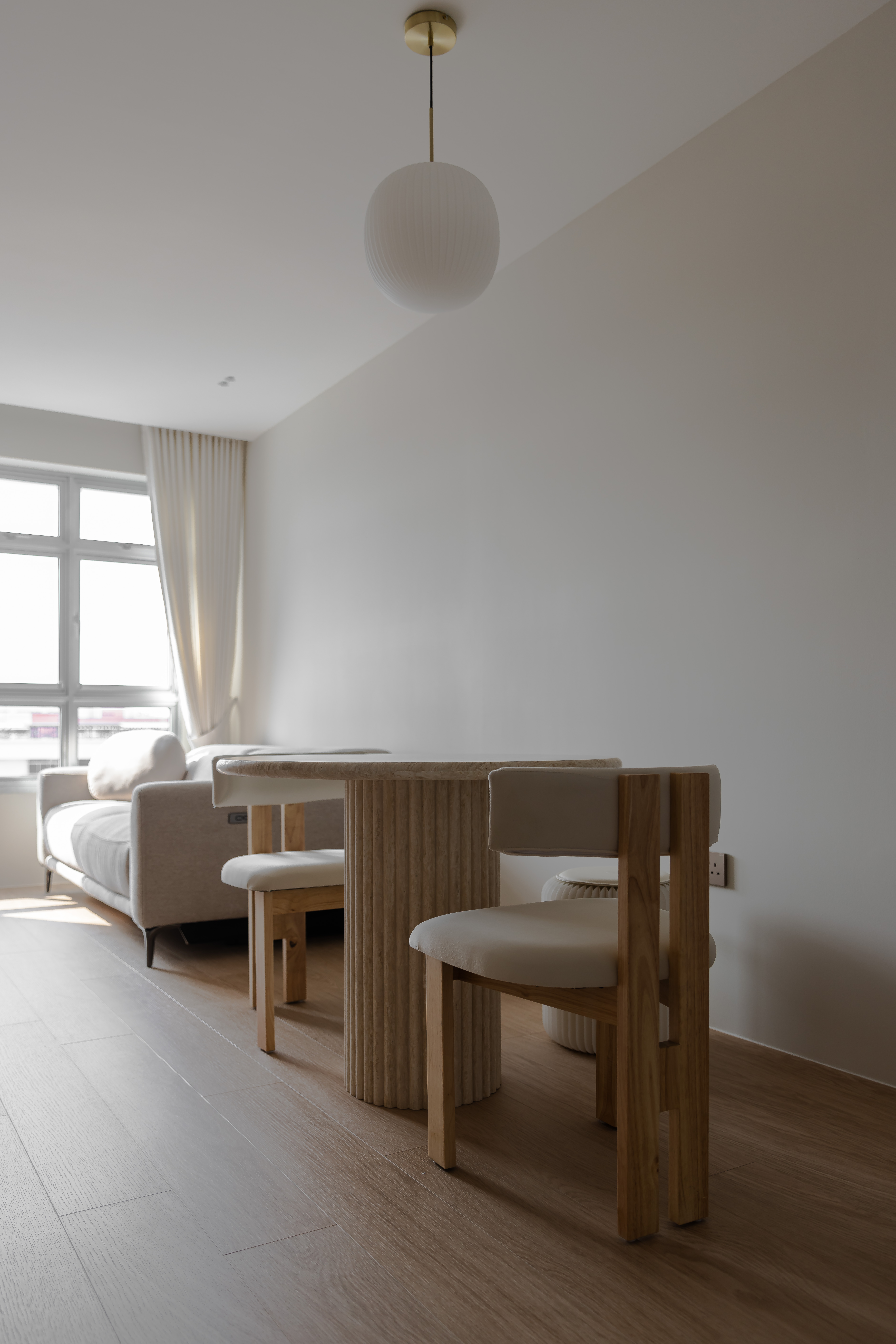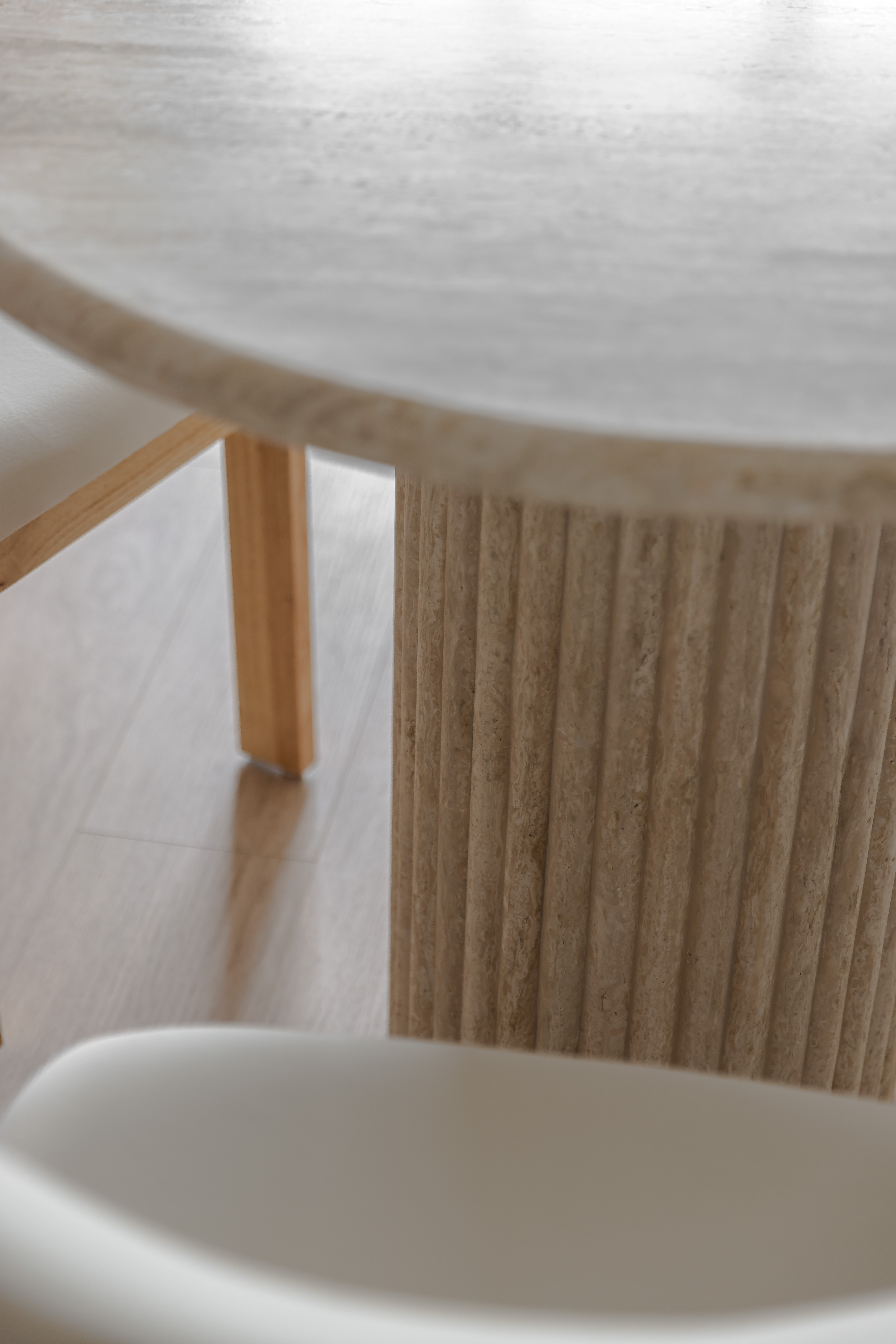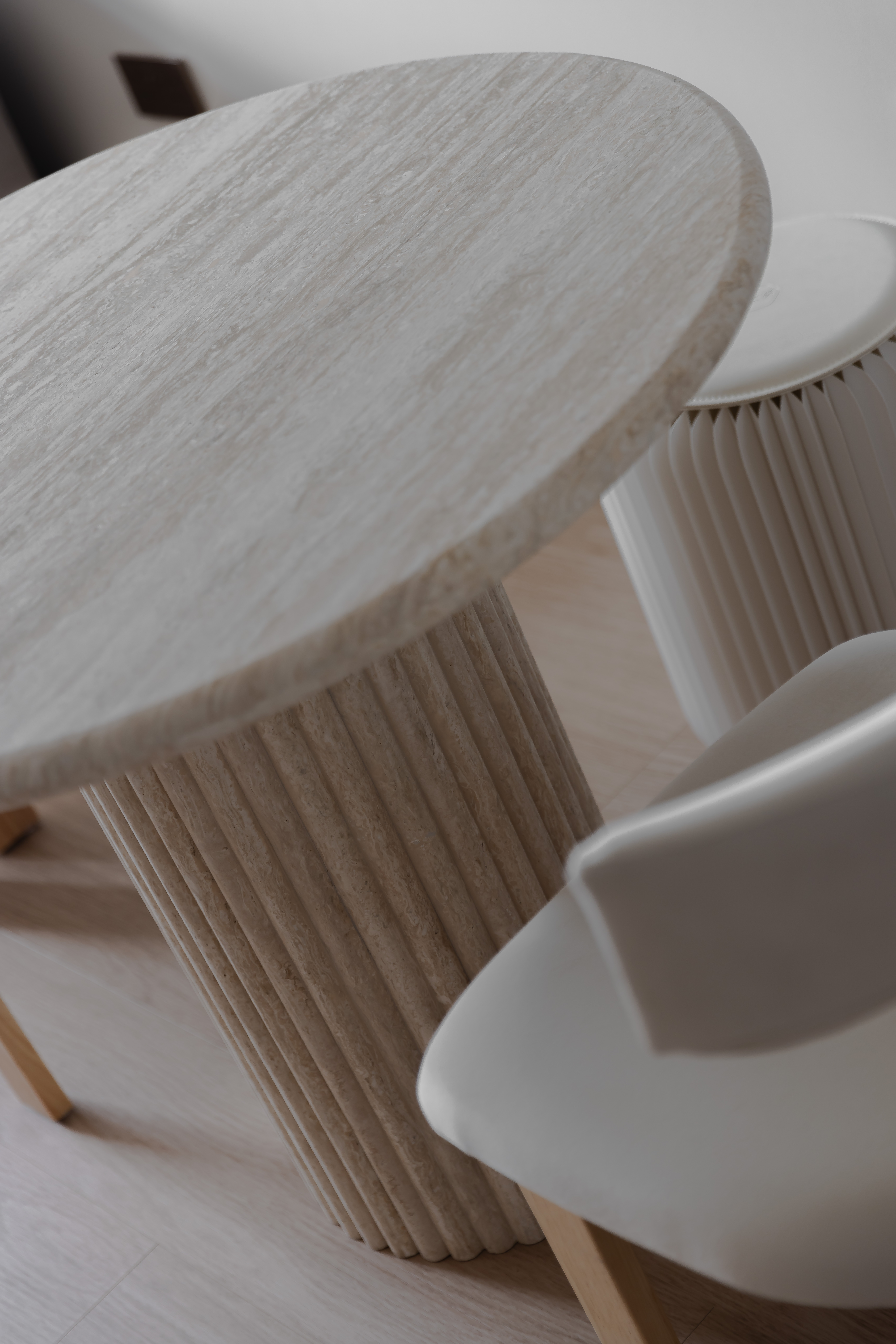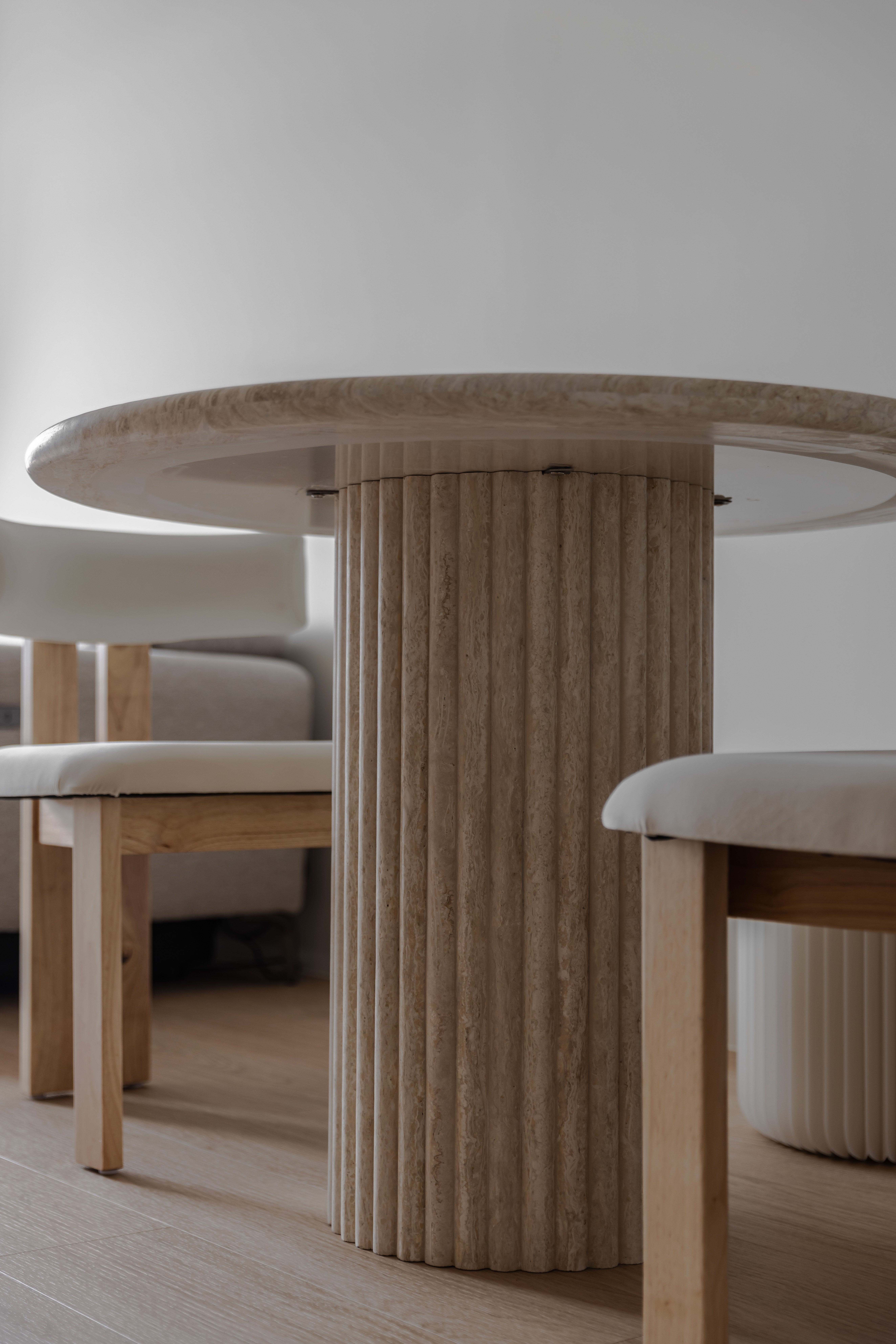 This minimalist residence seeks to be a grounding and serene retreat for its occupants. Our client wanted a space that felt light and bright and that complemented the home interior features like light oak vinyl flooring. A light beige travertine stone table with fluted paneling and blakely bouclé chair was customised to fit the home by colour to ensure cohesiveness. We also brought in the multi-functional dashiell pleated stool for an extra seating.