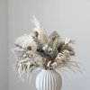 It features lush and abundant mixed floral arrangement that captivates with its serene beauty and elegant textures. At its core are stems and foliage in shades of textured white and cream, creating a soft and harmonious base.