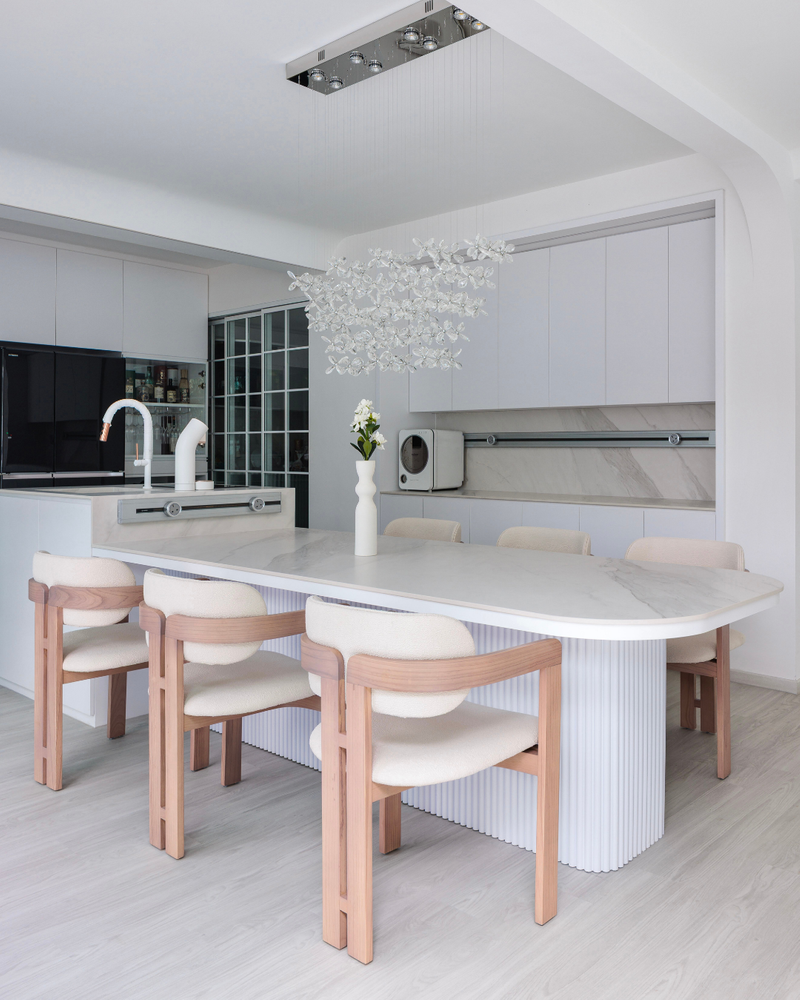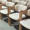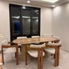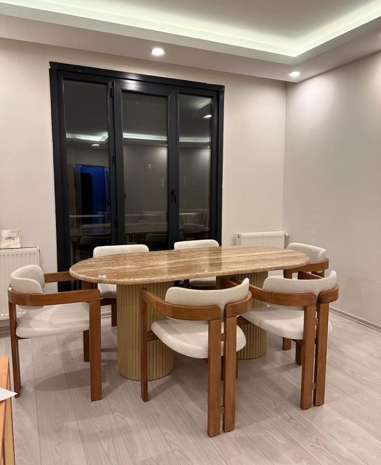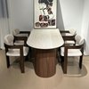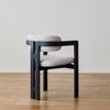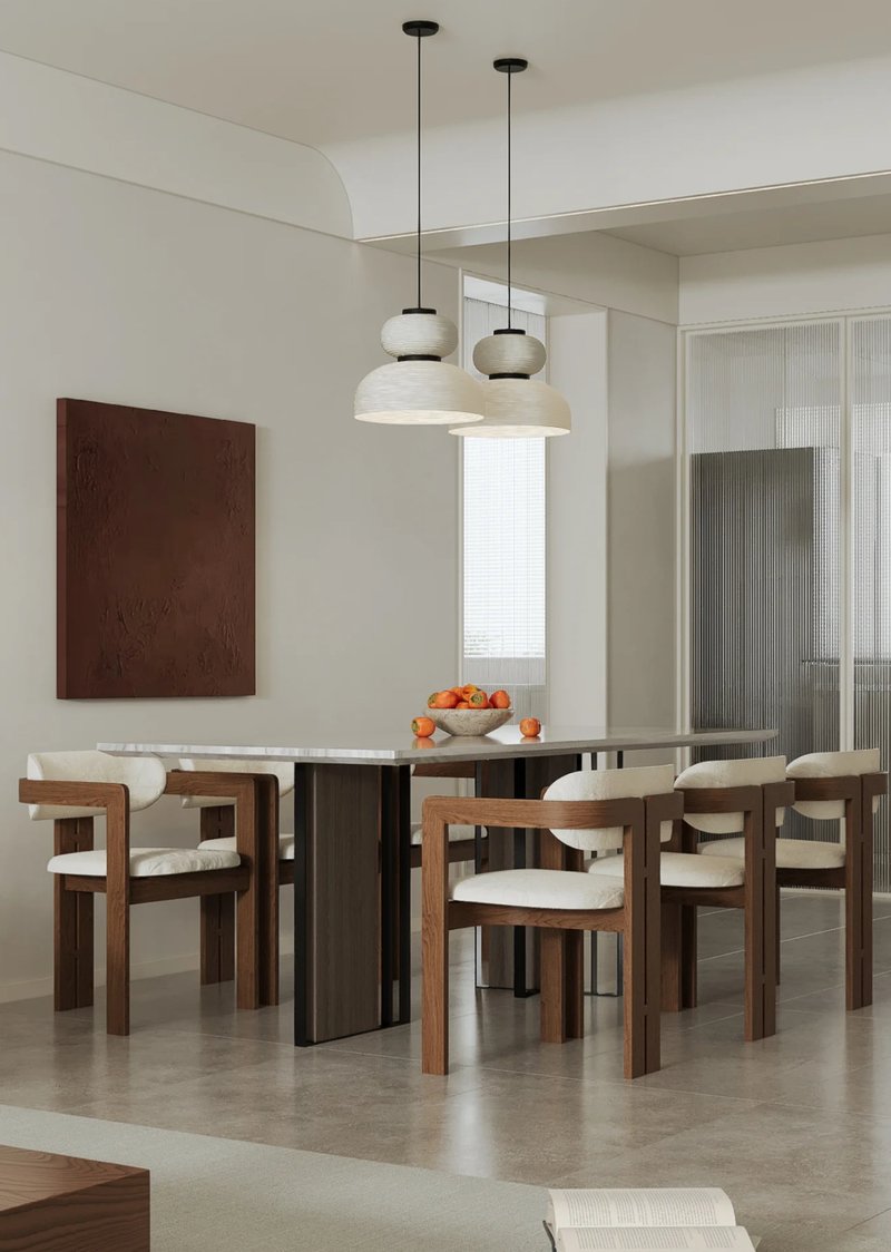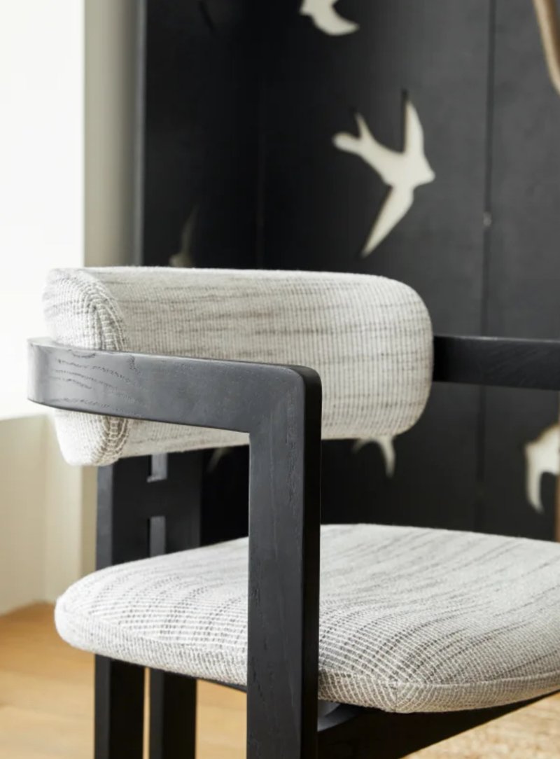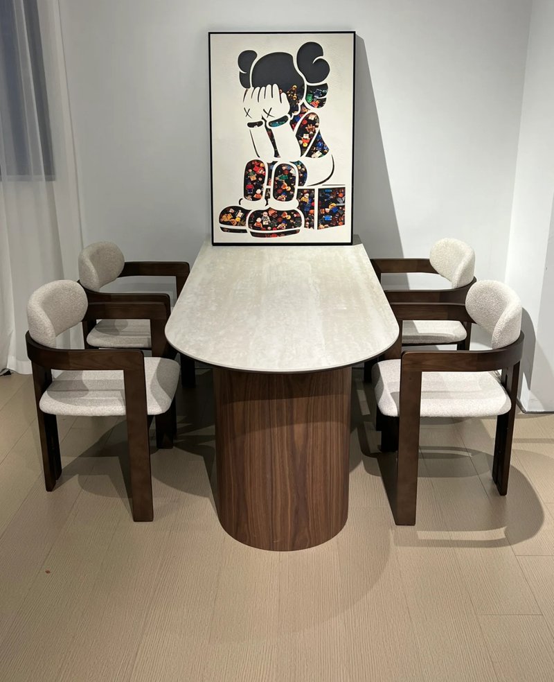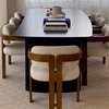 Our Benoît curved dining chair combines luxury with comfort, embodying a sophisticated reinterpretation of 1970s design. Its plush curves and rich walnut finish create a timeless elegance, while the off-white bouclé fabric adds a refined textural contrast.