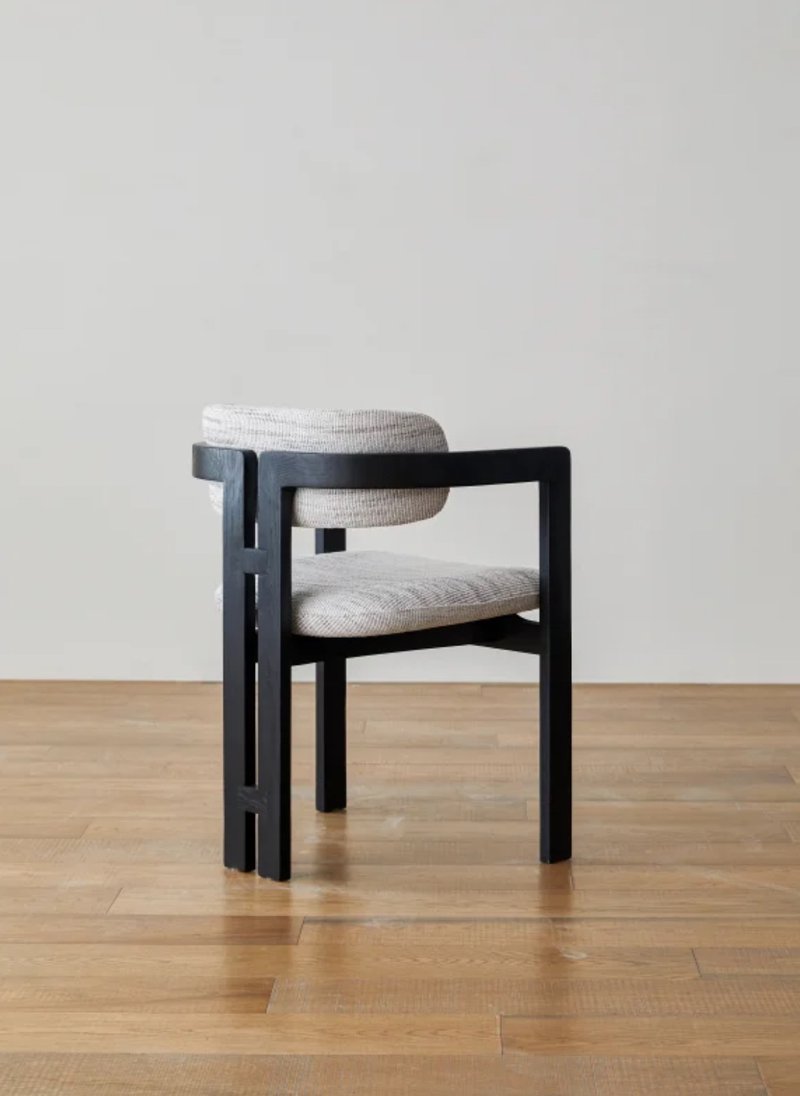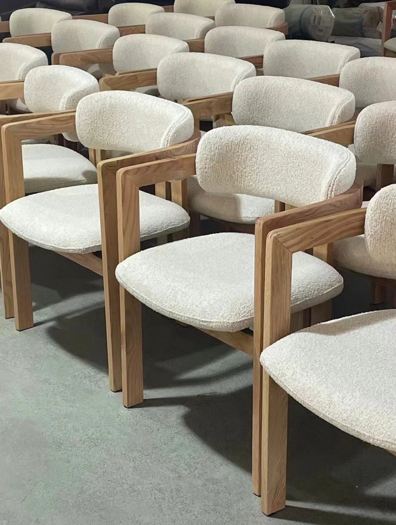 Crafted for both style and comfort, the fixed seat features premium foam padding upholstered in signature bouclé fabric, ensuring hours of enjoyable dining. The frame, made from solid ash and stained in a deep walnut hue, seamlessly blends strength and beauty, making this chair a stunning addition to any dining space.