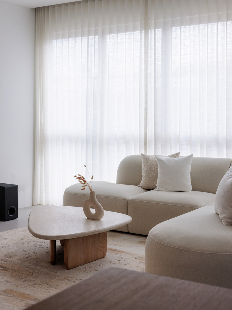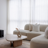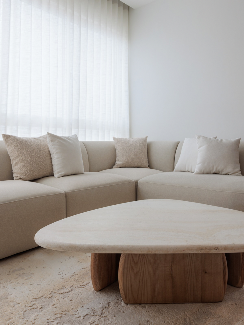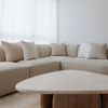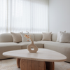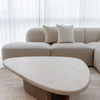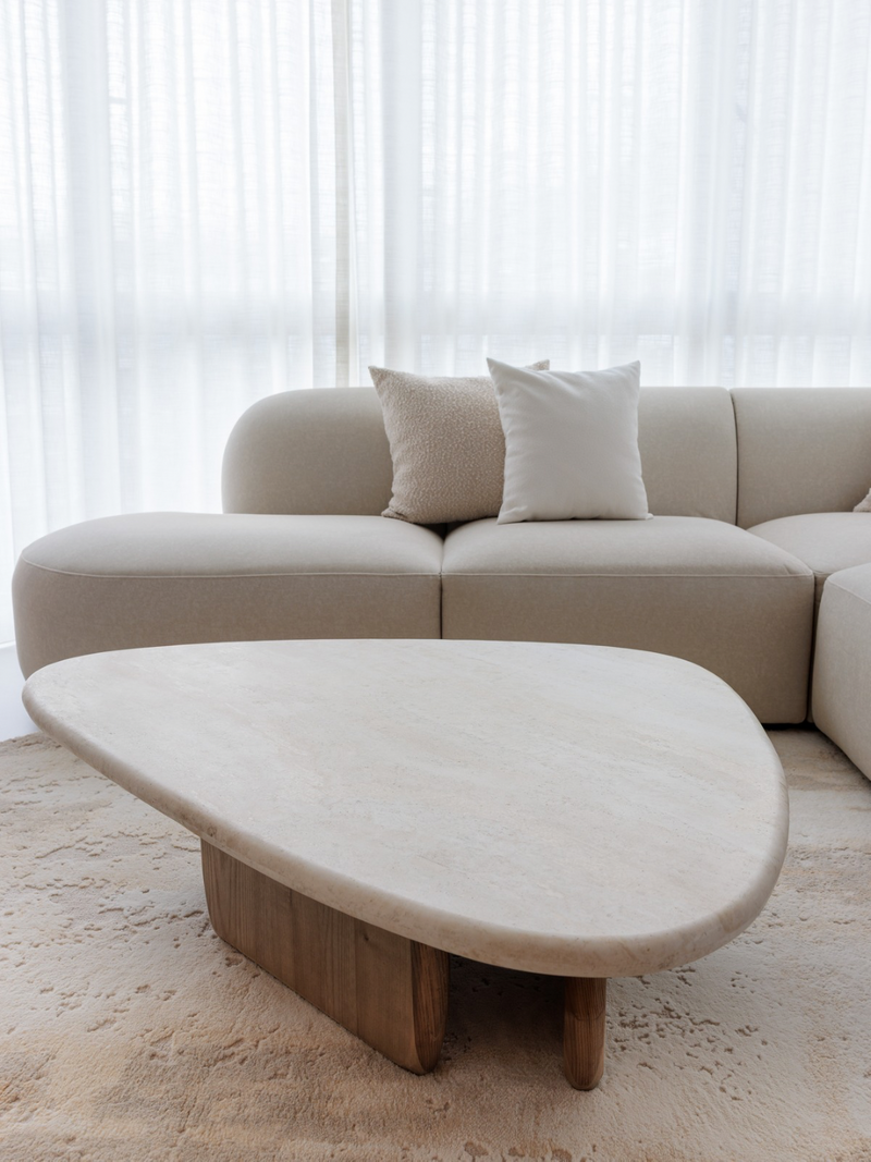 Thoughtfully curated and lovingly crafted for our client at Gardenvista, Singapore, this piece is now available online by popular request. Featuring a luscious travertine slab in a sculptural puddle form, the tabletop rests gracefully on three solid ash wood bases — a charming centerpiece on its own while also elevating anything placed upon it. Positioned with ease, it transforms into a sleek coffee table that flows seamlessly alongside an L-shaped sofa.”