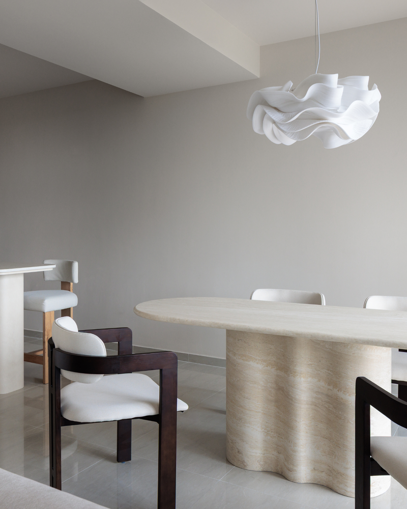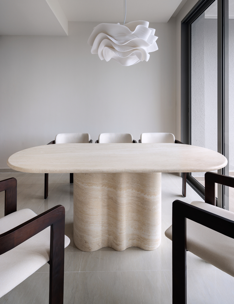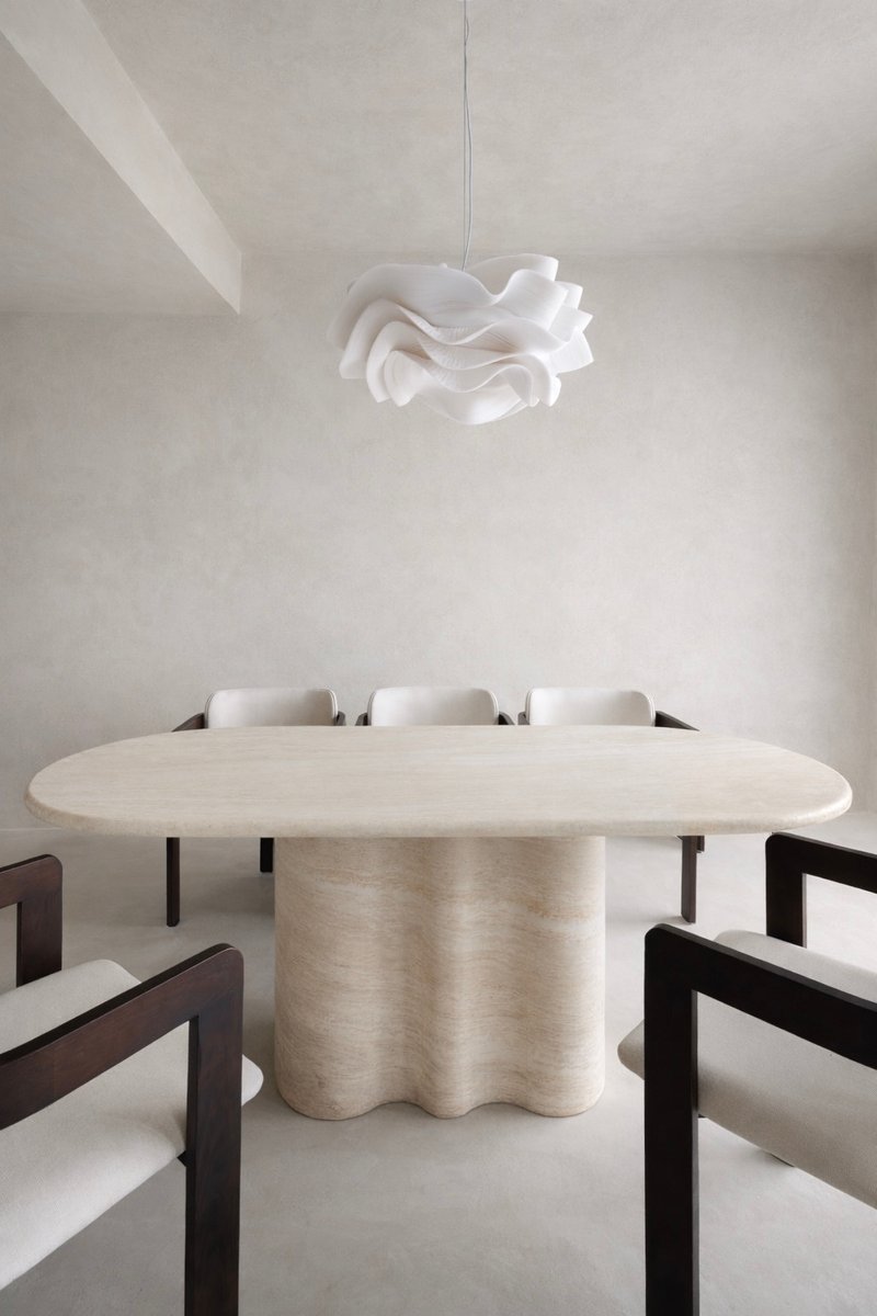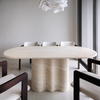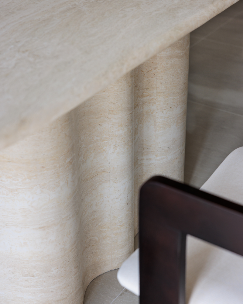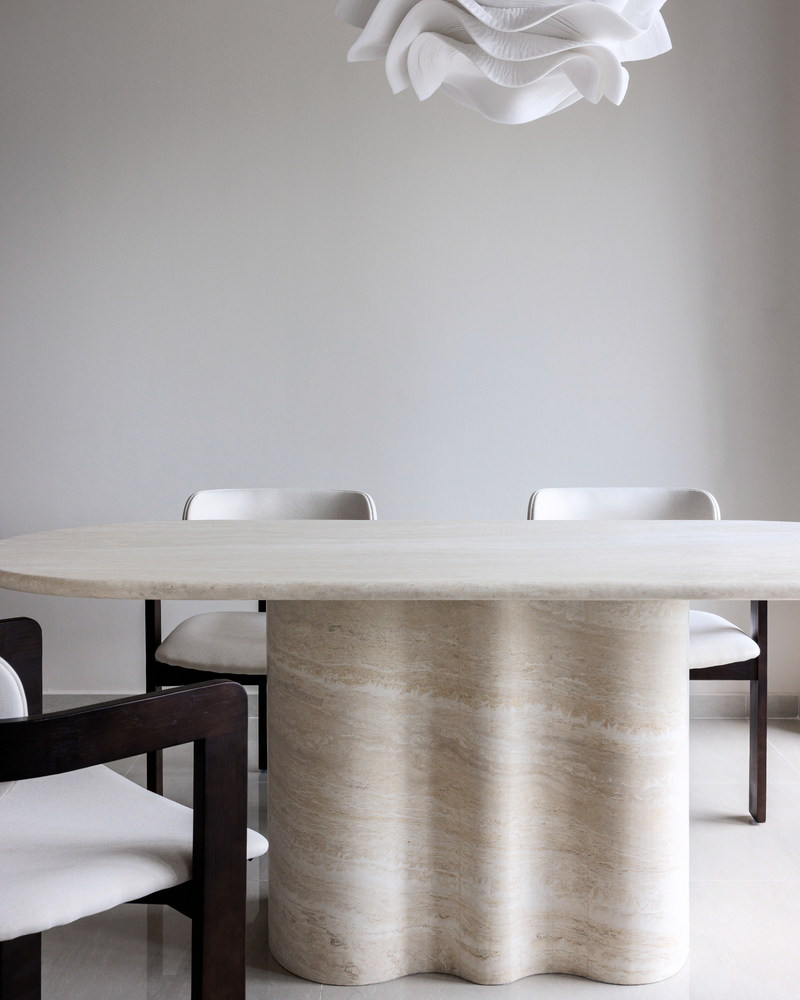 Named in honour of one of our earliest clients who placed their trust in us, the Carlyn Table is a quiet celebration of support, craftsmanship, and thoughtful design. Here, bespoke form unfolds with effortless grace. Defined by its gently contoured oblong tabletop with a soft bullnose edge, each dining table is designed to flow harmoniously within any dining space—offering a poetic balance between modern form and timeless beauty. Crafted from natural travertine stone, every piece tells its own story through delicate veining, organic textures, and subtle tonal variations.