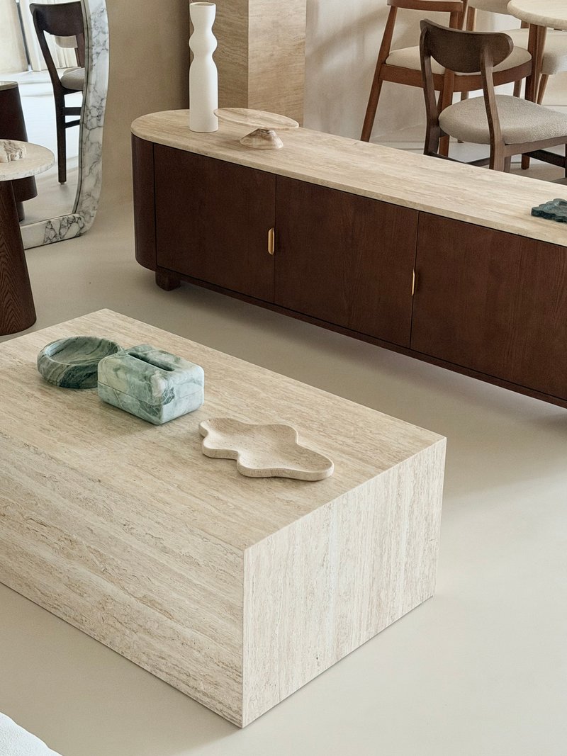 • Customisation Available: Choose from six exquisite types of travertine, including classic beige, luxurious super white, and more, each with its unique color variations and natural patterns. Specify the exact dimensions you require, whether for a dining table, coffee table, or bespoke furniture piece. Speak to us to find out more.