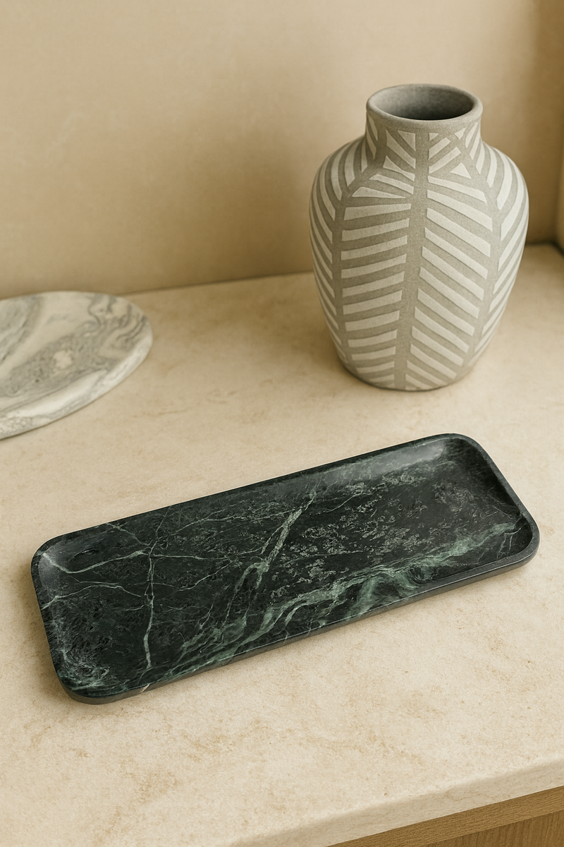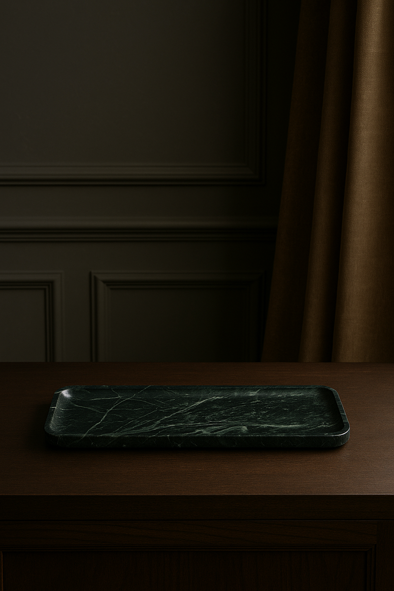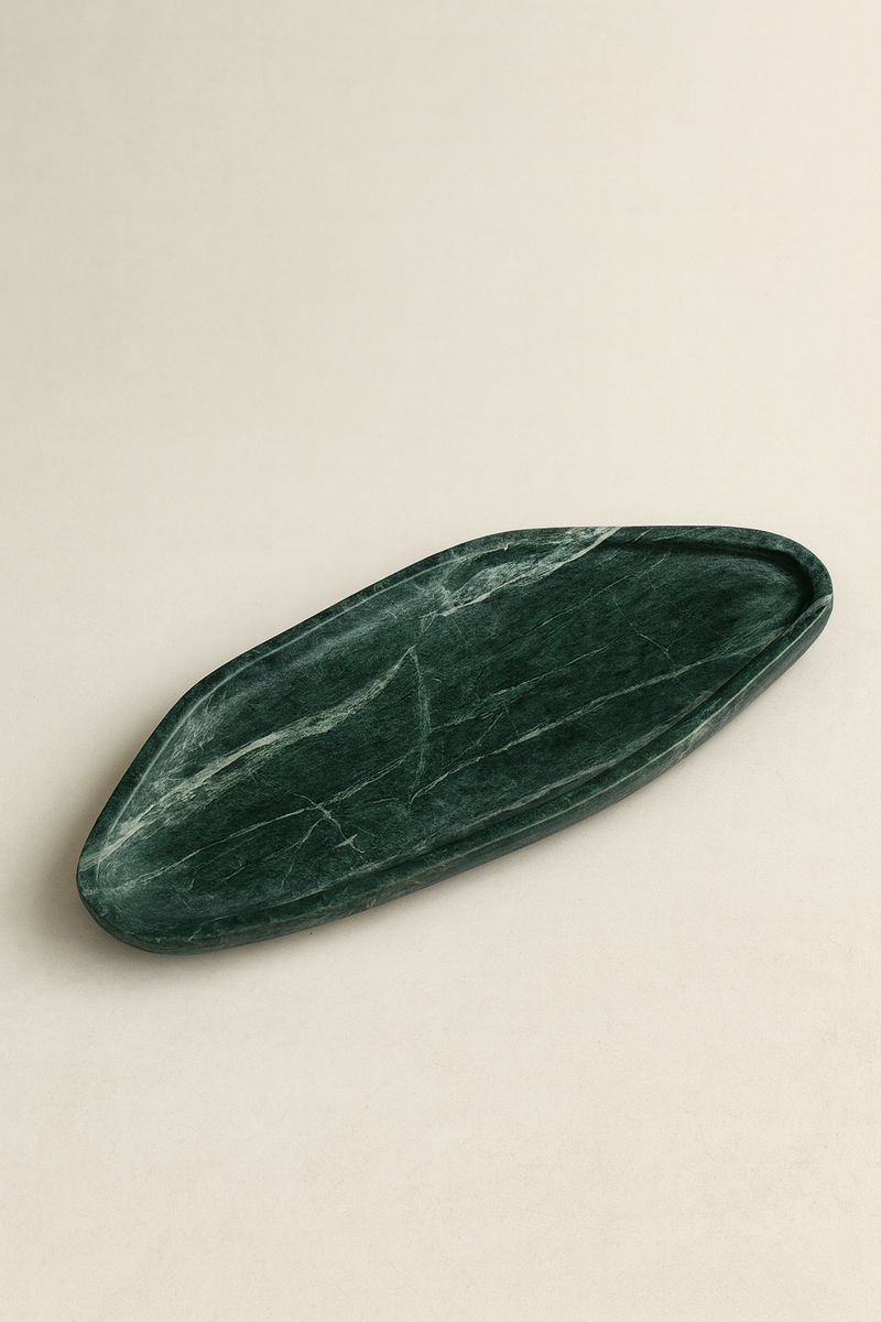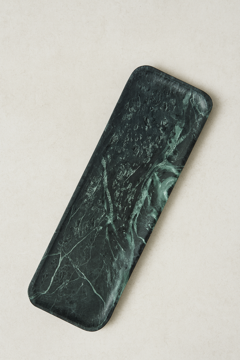 Handcrafted from exquisite India Alpi Verde Green Marble, this tray reveals a mesmerising tapestry of deep forest greens adorned with delicate, flowing white veining. Its softly curved edges and gentle semi-gloss sheen lend an ethereal glow—capturing that quiet-luxury charm that feels both grounding and enchanting.