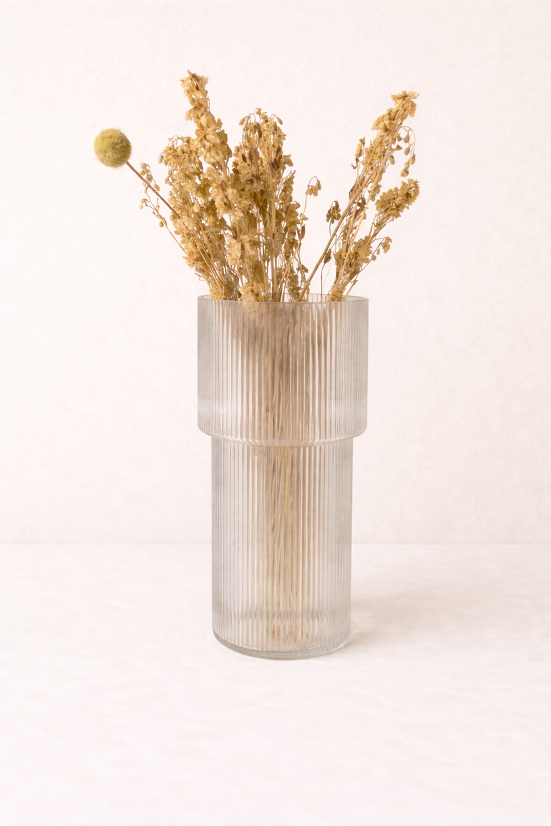 Our Jolie Fluted Glass Vase is a stunning piece that combines elegance with contemporary design. Crafted from high-quality glass, this vase features a beautifully fluted texture that catches and reflects light, adding a touch of sparkle to any space. Its slender, elongated shape and delicate curves make it a perfect vessel for showcasing fresh or dried flowers. Our Jolie vase is versatile and sophisticated, making it an ideal centerpiece for your dining table, mantel, or any other prominent spot in your home. Available in two style - column vessel or wave, this vase effortlessly complements various decor styles, bringing a touch of refined beauty to your interior.