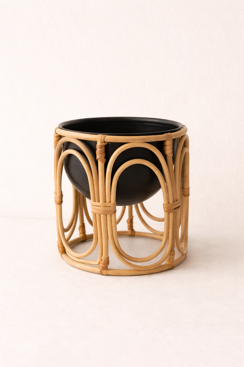 Thoughtfully designed with an intricate woven rattan outer shell, it comes complete with a discreet black inner container—making it fully waterproof and easy to style. Perfect for adding natural texture and warmth to any corner of your home, indoors or out.