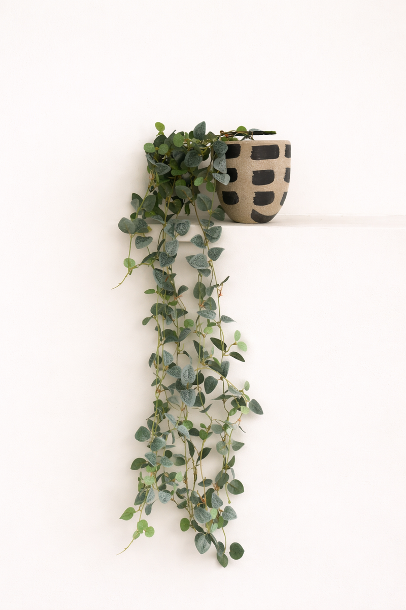 A light sand–toned rounded pot, brushed with black strokes paired with ready-to-style, realistic faux green vines. Designed to bring a soft, natural touch to shelves, consoles, or tabletops without the need for maintenance.