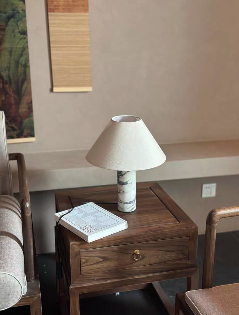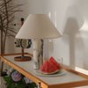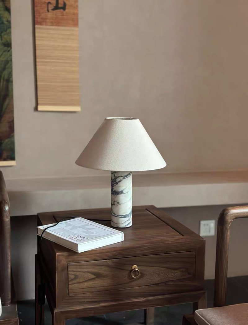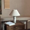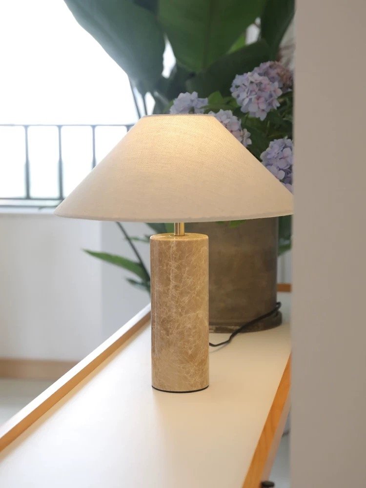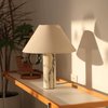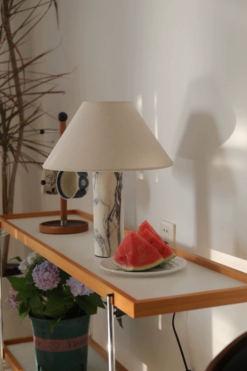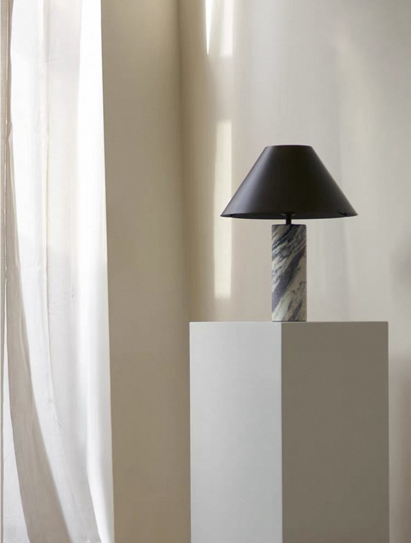 Nymeria features a base crafted from Italian Calacatta Viola marble, renowned for its bold natural veining. It is topped with an umbrella-shaped conical shade in cream linen, or in black metal if you prefer a darker statement. Striking a perfect balance between sculptural presence and subtle warmth, this lamp comes with a tri-colour light bulb, allowing you to switch between lighting tones to suit any mood or setting.