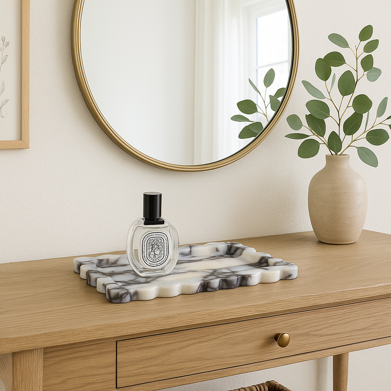 Handcrafted from exquisite Italian Calacatta Viola marble, this tray is a true statement of timeless beauty. Its softly scalloped edges and glossy finish evoke a sense of quiet luxury, making it as functional as it is enchanting. Whether styled with desserts, candles, or your favorite trinkets, it brings a touch of dreamy elegance to any corner of your home.