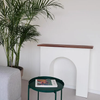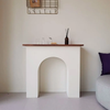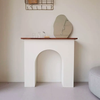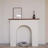 This exquisitely crafted concave arched fireplace mantelpiece seamlessly integrates with walnut wood plank as top shelf for your favorite accessories, such as vases, candlesticks, candelabras, as well as decorative objects. The design offers a harmonious blend of classic elegance and modern functionality, making it a versatile addition to any living space. Its sturdy construction ensures durability, while the smooth finish and intricate detailing elevate its aesthetic appeal, creating a focal point that enhances the ambiance of your home.