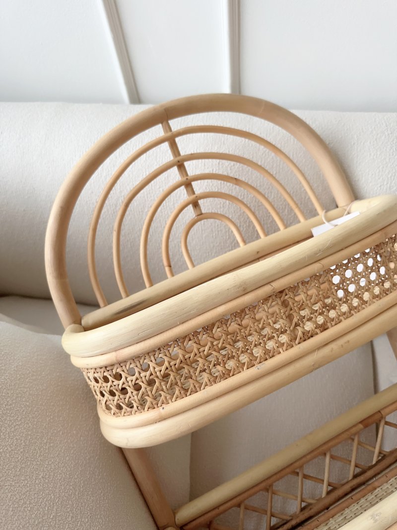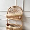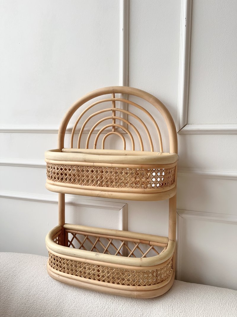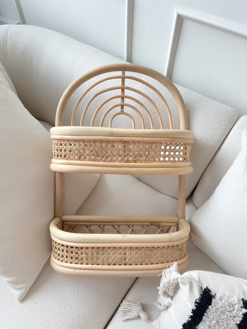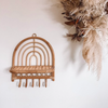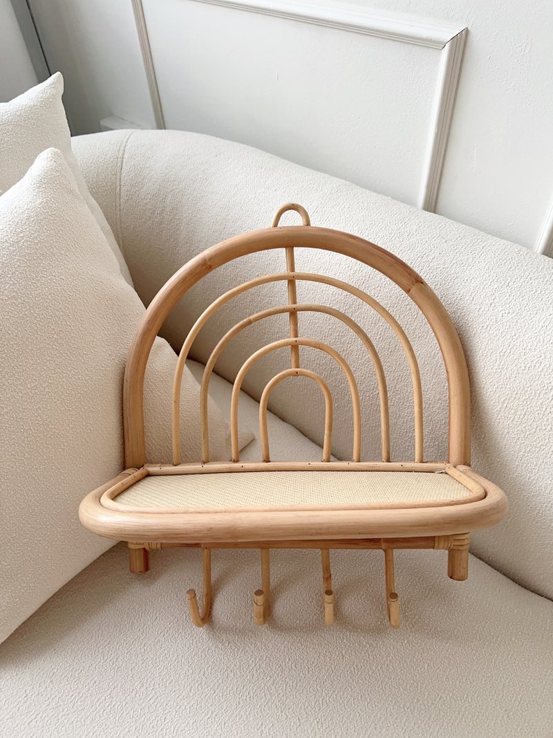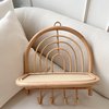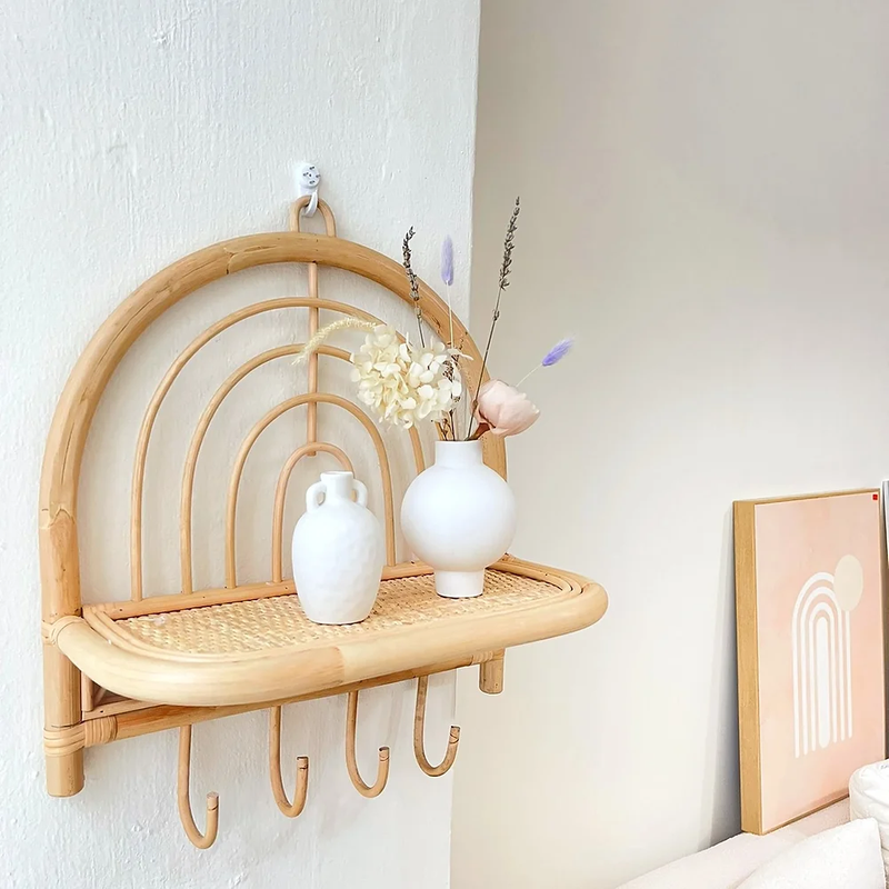 Introducing a joyful new addition to our boho rattan collection. Perfect for your child's nursery or playroom walls, it features a one-tier shelf for display and four hooks crafted from sustainably grown rattan. This piece is not only light and practical but also strong and durable.